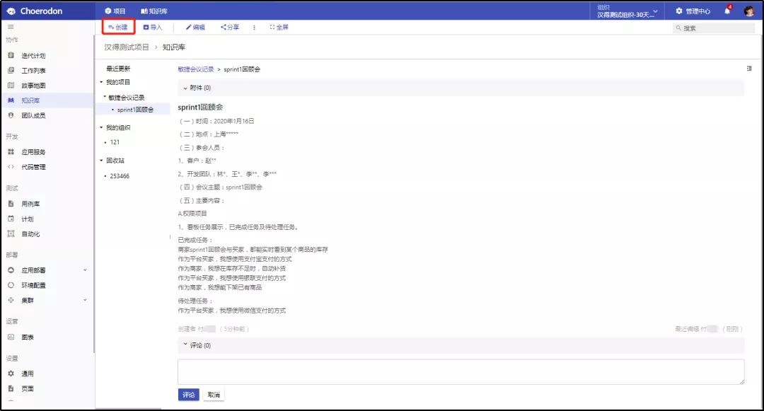 在进行敏捷回顾会议时,开发团队可以使用 Choerodon 猪齿鱼中知识库进行会议记录。