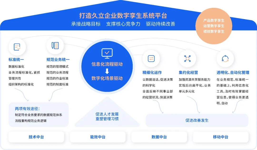 通过在传统前后端之外搭建中台,有效统合前后端资源,信息流顺畅流转,最终实现多系统集成式数字化平台,推动企业核心业务一体化,助推企业“降本增效”。