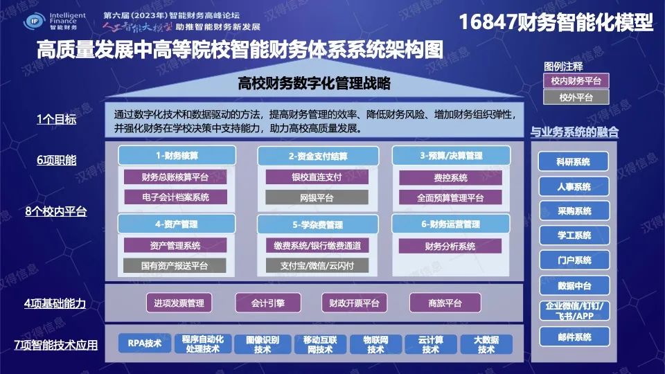 HAND VISION 高质量发展中的高等院校 智能财务体系建设研究 01 研究背景 高等院校作为培养国家基础研究人才的主力军和攻关“卡脖子”关键核心技术的国家队,肩负着重要责任!近几年,高校也在不断地通过科研、教学、管理等方面变革,实现高质量发展。 全面数字化、智能化校园建设是高校高质量发展的基石,很多高校已经从教学、科研、后勤、人事、财务等领域全面发力。财务智能化作为高校高质量发展的重要发力点之一,其效果直接影响学校科研经费的使用效率、师生的工作效率,进而对高校高质量发展产生深远影响。 人工智能新技术为重塑高等院校财务管理工作打开了巨大的想象空间。然而,针对高等院校智能财务体系建设的研究还相对较少。目前,国内外已有一些研究探讨智能技术在财务管理中的应用,但尚未有系统性地研究关注高等院校智能财务体系的构建和实践应用。 02 高校财务组织及智能化现状 汉得联合多位高校财务教授、智能财务实践专家们组成课题研究小组,经过一个半月的问卷调研,以及深入的实地访谈,收集了全国23所高校的智能财务建设情况。 ▲ 高校财务组织及智能化现状 基于广泛的案例研究分析,结合企业已经应用成熟的智能财务技术应用场景,整理出了财务体系与周边业务系统交互的主要数据。 结合数据不难发现,大部分高校财务正在紧紧拥抱智能化技术! 大部分高校在RPA技术、程序自动化处理技术、图像识别技术移动互联网技术、物联网技术、云计算技术、大数据技术上均有智能财务的应用。 ▲ 高校财务智能化普及情况及实践特点 同时我们会发现,高校对财务智能化应用效果的关注上,不仅有提升内部管理效率的应用,还重视提高财务部对外的服务能力的应用。 高校财务部通过优化服务流程、提高对外服务效率、加强风险监控、提高数据的使用效率,从而提高整个学校的运营效率,同时在这个过程中,也非常关注服务对象的满意度。 这充分表现出中国式现代化思想在高校财务部门的体现,财务部门有了更多的换位思考,更加注重对外服务及用户体验、注重数据分析与预测、监控与风险管理、决策支持与战略规划以及服务提升等方面的应用。这种思维上的改变有助于提升高校财务部门的价值和作用,促进学校的高质量发展。 03 “16847”财务智能化模型 研究小组按照新发展格局要求再造财务组织架构与管理流程,设计出适应高校战略发展需求的新型财务管理体系,创新性的提出了“中国式现代化高质量发展中的高等院校智能财务体系架构”——“16847”财务智能化模型,为高等学院的财务管理提供了新思路和新方法! ▲ 16847财务智能化模型 “16847”财务智能化模型,致力于通过数字化技术通过数字化技术和数据驱动的方法,提高财务管理的效率、降低财务风险、增加财务组织弹性并强化财务在学校决策中支持能力,助力高校高质量发展! ▲ 汉得在高校智能财务领域的服务能力 未来,汉得智慧财务团队将持续深入探讨如何更好地通过智能化技术,提升高校财务管理工作的效率和质量,结合汉得在高校智能财务建设中的实践经验,为高等院校的高质量发展提供更好的支撑和保障! 数字化,放心交给我!