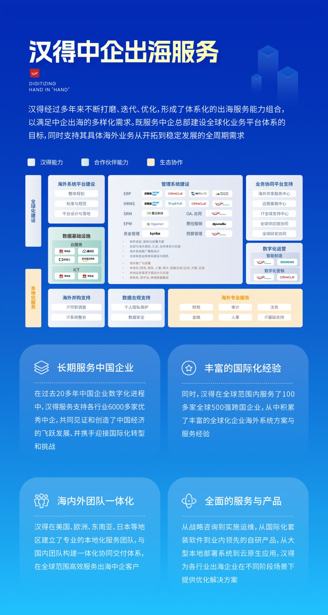 经过多年来不断打磨、迭代、优化,汉得已经形成体系化的出海服务能力组合,以满足中企出海的多样化需求。既服务中企总部建设全球化业务平台体系的目标,同时支持其具体海外业务从开拓到稳定发展的全周期需求。