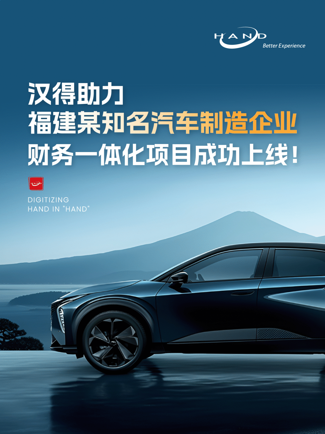 近日,福建某知名汽车制造企业财务一体化项目成功上线!作为国内知名的汽车制造企业,该客户历经多年的生产经营,一直积极探索企业的信息化数字化建设,以提升企业的运营效率和管理水平,追求企业高质量发展。本次财务一体化项目,基于汉得自主研发的智慧财务套件HFINs,深入连接公司各大业务系统,携手实现业财数据联动、自动记账及财务交易分析。项目通过预算精细化管理,提高企业内控管理水平,构建财务共享作业模式,实现核算标准化、财务集中作业,同时建立电子化档案系统,进一步推动流程无纸化建设,提升财务工作效率与质量,推动公司财务管理转型升级,为公司财务数字化建设注入新的活力!深耕汽车生态行业财务数字化赋能中国制造高质量发展截至2024年11月,汉得已先后帮助五家汽车生态行业客户伙伴,成功上线智能财务项目,另有四家车企客户伙伴的财务数字化项目,也将于年内奔赴上线!2024年,汉得预计将帮助9家汽车生态行业企业,成功上线智能财务系统!汉得智慧财务套件WHY HAND汉得智慧财务团队是国内规模领先的财务数字化综合团队,拥有超过20年、2000余家企业财务数字化建设实践经验,以丰富经验、先进的产品方案,以及专业服务能力,帮助企业构建先进的财务管理体系,同时与众多汽车行业客户保持长期紧密的合作关系。汉得智慧财务套件(HFINs)依托于先进技术和最新的管理理念,以开放式架构支持基于场景和业务需求的自由选装和场景化配置,帮助企业构建数字化时代的财务管理体系、财务组织架构和财务运营模式,在业务高速发展和信息技术快速变革的过程中,实现业、财、税的深度融合,实现5G时代的全财务域智能化管理。汉得作为企业数字化综合服务商,始终致力于成为连接企业管理与数字化技术的桥梁,助力客户实现全面数字化转型,为客户持续创新与价值创造保驾护航!