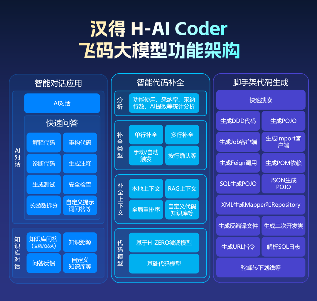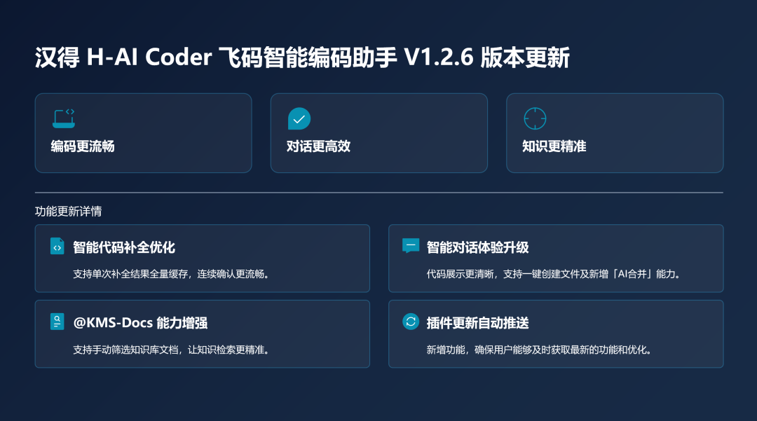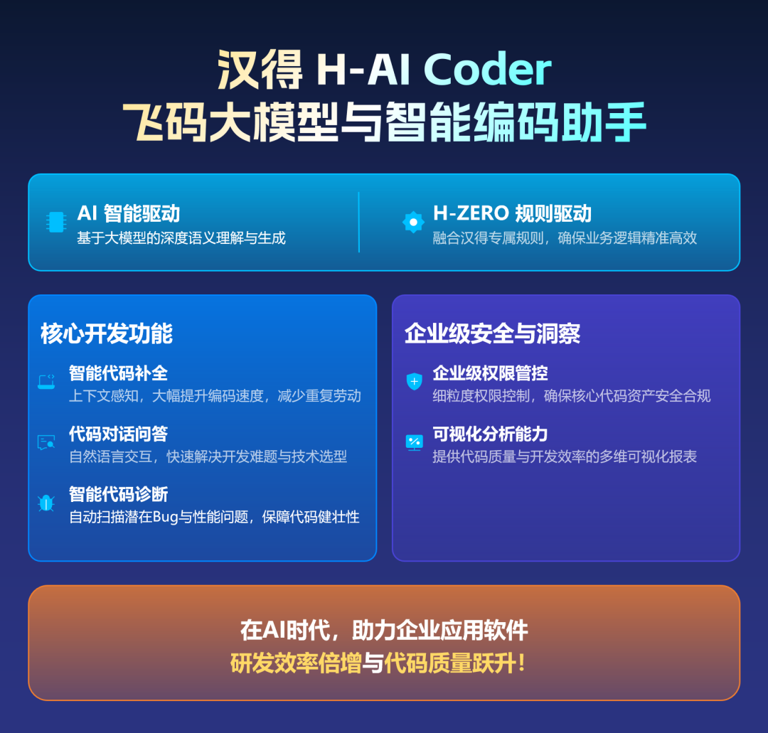 行业内多款模型 AI Coding 能力相继升级迭代,在代码生成、长上下文处理等核心能力上实现突破性进展,更有全新架构升级加持,持续推动 AI Coding 效率迈入新台阶。 汉得 H-AI Coder 飞码大模型追随技术进步持续迭代升级,精准匹配企业级软件开发需求,为企业数字化软件开发注入强劲动力! 开发效率再提升 30% 汉得 H-AI Coder 飞码大模型 汉得 H-AI Coder 飞码大模型,基于 DeepSeek Coder 大模型,采用 Post-Pretrain 和 Lora 微调技术,在 Post-Pretrain 阶段使用超 170 万行代码数据,Lora 微调阶段应用超 4 万个样本,历经 50 多轮训练,总时长超 2000 小时,已实现深度内化,完美契合企业及应用软件开发需求,助力 H-ZERO PaaS 平台生态应用软件开发效率再提升 30% ! 代码质量持续跃升 汉得飞码智能编码助手 汉得 H-AI Coder 飞码智能编码助手持续迭代升级,从 V1.1.2 到 V1.2.6,每一个版本都带来惊喜。 V1.1.2 版本聚焦企业知识融合与开发提效,支持多源上下文引用,深度融合企业知识库(KMS-Docs)与内置 H-ZERO 规则,让 AI 生成的代码更贴合实际业务场景。 同时还提供智能代码补全、智能提交记录生成与智能代码审查功能,同时新增 AI 思考过程展示、图片预览等实用功能,全面提升开发体验。 V1.2.4 版本在上下文感知、开发流程、交互体验上全面优化。 智能代码问答新增多类型上下文选择及推荐能力,智能代码补全支持本地代码库自动检索增强;新增一键生成 Commit Message、智能审查代码变更,支持智能代码搜索;持续优化性能与稳定性,让开发更顺畅。 V1.2.5 版本让 AI 问答深度融合企业知识,支持 @KMS-Docs 企业知识融合,结合本地上下文与远程 RAG 知识片段,答案更贴合企业语义与业务场景。 智能提效工具升级,新增一键生成服务技术文档功能,集成控制台报错智能诊断;智能代码补全优化交互与结果处理逻辑,编码更连贯。 V1.2.6 版本围绕 “编码更流畅、对话更高效、知识更精准” 持续打磨。 智能代码补全支持单次补全结果全量缓存,连续确认更流畅;智能对话体验优化,代码展示清晰,支持一键创建文件、插入 / 替换代码等操作,新增「AI 合并」能力;@KMS-Docs 能力增强,支持手动筛选知识库文档;还新增插件更新自动推送,确保用户及时获取最新功能。 汉得 H-AI Coder 飞码大模型与智能编码助手,结合 AI 智能驱动与 H-ZERO 专属规则驱动,支持智能代码补全、代码对话问答、智能代码诊断等多种场景,还具备企业级权限管控及可视化分析能力。 在 AI Coding 成为行业热点的当下,它们无疑是企业提升开发效率、保障代码质量的不二之选! 想要体验这强大的开发工具吗? 关注汉得 获取更多 关于 H-AI Coder 飞码的最新动态 携手开启智能开发新时代!