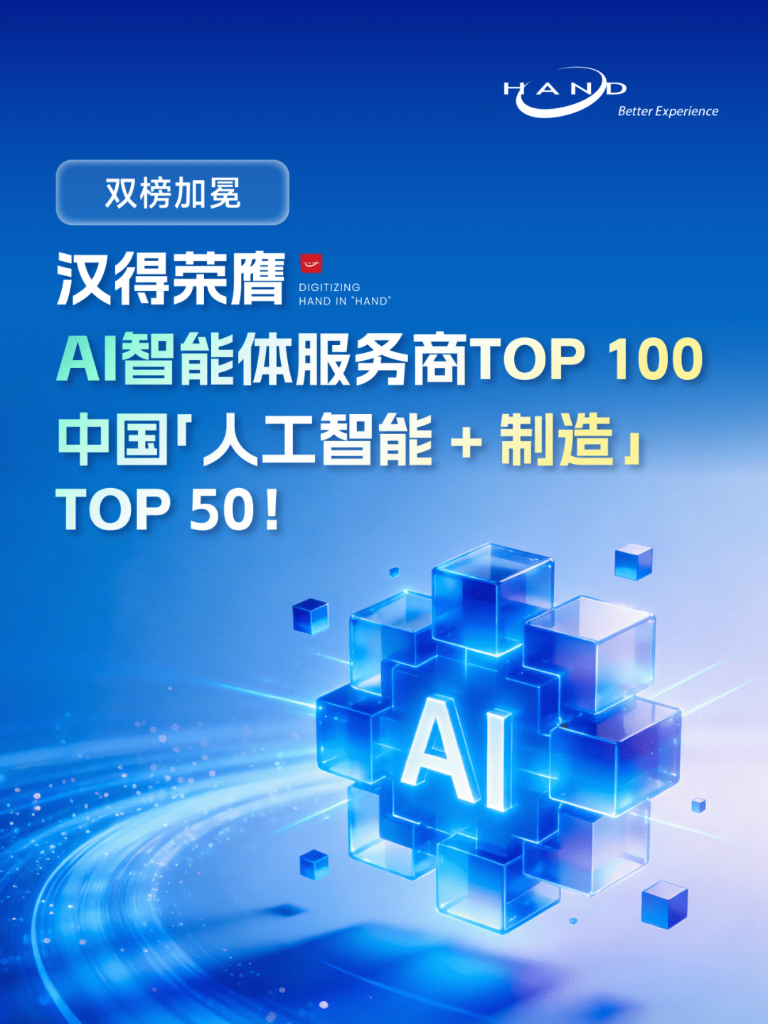当AI技术深度融入制造肌理,当智能体从技术概念成为企业数字化转型的核心抓手,汉得始终以场景驱动智能、技术赋能产业为核心,在AI与制造的融合赛道上持续深耕。 近期,汉得成功入选由中国科学院《互联网周刊》联合eNet研究院、DBC德本咨询等权威机构发布的“2025 AI智能体服务商 TOP100”与“2025 中国‘人工智能 + 制造’TOP50”双榜单! 这不仅是对汉得在AI智能体技术创新与落地能力的充分肯定,更是对汉得深耕制造业数字化转型、推动AI与工业场景深度融合实践成果的高度认可,再次彰显汉得在企业智能化升级领域的硬核实力与行业引领地位! 灵猿智启 打造企业级AI智能体标杆 汉得长期深耕企业服务,对企业业务有着深刻理解,深谙企业AI转型难点,基于对场景的深度洞察,打造出更贴合企业实际需求的“能落地、好上手”的AI智能体解决方案,构建起“场景 + 工具 + 底座”的全栈布局,全面覆盖企业从用智能体到建智能体的全流程。 作为国内领先的企业智能化解决方案提供商,汉得依托「汉得灵猿智能体开发平台」在自然语言处理、知识图谱与自动化决策等领域的深度融合,为金融、制造、零售等多个行业数字化转型持续注入澎湃动能,真正实现AI能力与企业核心业务流程的深度融合应用,释放可持续的数智价值。 数融制造 以AI赋能产业高质量发展 此次同时登榜2025中国“人工智能 + 制造”TOP50,是对汉得将AI技术深度融入制造全流程、助力中国制造高质量发展的最佳印证。 在制造领域,汉得坚持以技术+场景双轮驱动,将AI智能体与工业生产全流程深度融合,打造多个标杆案例,为企业带来实打实的效能提升与价值增长。 同时,依托自主创新的H-ZERO企业级PaaS平台与近30年行业积累,汉得构建起“咨询+产品+服务”三位一体的数字化服务体系,并在多行业拓展、AI融合应用与全球化布局中实现跨越式增长,为中国制造高质量发展注入强劲动能。 面向未来,汉得将继续秉持“以场景驱动智能,以技术赋能产业”的核心理念,持续深化灵猿AI中台在垂直场景的渗透能力,持续迭代智能体自学习与多模态交互技术,强化跨系统协同与实时决策支持能力。 同时,进一步深耕产业场景数智化转型,加速AI与工业软件的融合创新,打造更多可复制、可推广的“人工智能+制造”标杆案例。 汉得愿携手更多行业领先企业,共建AI与产业融合的开放生态,助力广大客户实现从“试用”到“规模化部署”的关键跨越,聚力同行,携手书写中国企业数智进化的时代答卷。 携手汉得,共铸硬核竞争力!