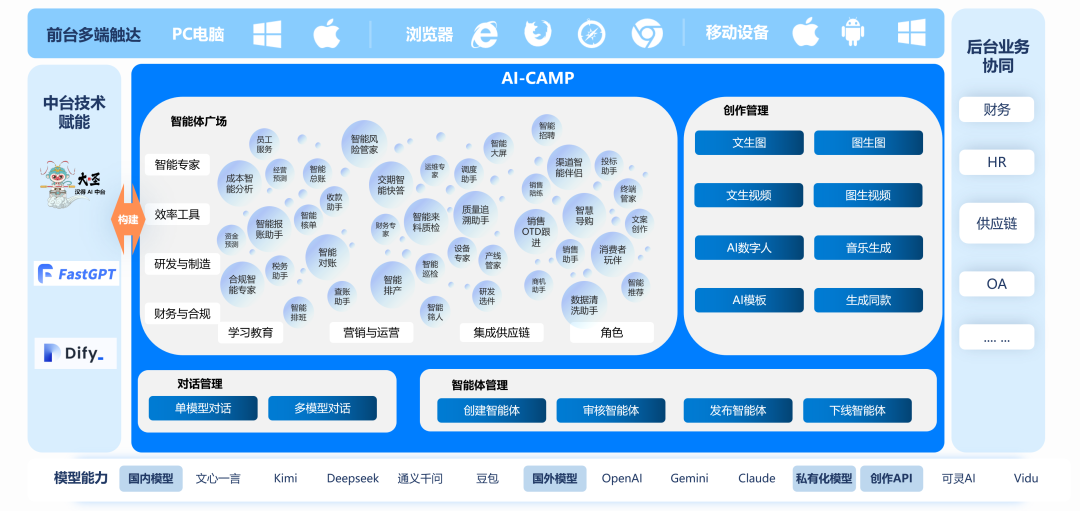 当全网都在热议能让AI“自己动手”的OpenClaw时,企业该如何思考? 是又一个需要独立部署、管理的“新玩具”,还是应被纳入现有体系、安全可控的“新战力”? 在AI加速渗透各行各业的今天,企业面临的已非简单的“用不用AI”,而是“如何高效、可控、可持续地用好AI”的复杂命题。技术栈的碎片化、工具的散落、能力的烟囱,正成为阻碍AI价值全面释放的隐形屏障。 近日,汉得大客户数智化事业部群正式推出智营AI应用聚合平台(AI-CAMP AgentHub)。 它并非又一个孤立的AI工具,而是“构建于AI中台之上的统一应用平台”,致力于将多元的AI能力——无论是来自开源社区、第三方专业中台,还是像 OpenClaw这样爆火的“执行型”AI——整合为一套完整、可控、可运营的企业级AI解决方案。 当AI从“聊天”走向“执行” 企业整合能力面临新考卷 企业的AI探索正从“点状试用”进入“面状部署”的深水区,随之浮现出新的挑战: 能力形态的“多维爆发” 汉得AI中台提供企业级稳健支持;FastGPT、Dify等赋予开发灵活性;而如 OpenClaw 这类“自主代理”的走红,则标志着AI正从“回答者”变为“执行者”。企业如何统一调度“思考型”、“创作型”与“执行型”等不同维度的AI能力? 热点工具的“治理真空” 像OpenClaw这样强大的个人生产力工具,一旦在组织内自发使用,会立即带来安全、合规与数据隔离的严峻挑战。其强大的本地执行能力若缺乏管控,可能成为新的风险点。 应用分发的“管理缺失” 各部门、各团队基于不同平台创建的AI应用(智能体)散落各处,形成新的“能力孤岛”。员工不知去何处寻找,管理者无法统一管控,更遑论沉淀复用与价值评估。 从“智能”到“产出”的链路断裂 智能对话产生的策略与创意,仍需跳转到其他工具才能转化为海报、视频等最终成果。思考与执行脱节,使得AI无法形成完整的业务生产力闭环。 企业需要的,是一个能够前瞻性地整合不断涌现的新AI形态,并将其纳入既有治理框架,最终驱动业务价值完整实现的“聚合神经系统”。 汉得 AI-CAMP 定义企业级AI应用平台新范式 AI-CAMP 的核心理念是“聚合”与“赋能”。它旨在成为企业所有AI能力的“总控中心”,向上灵活接入各类AI生产力,向下以标准化、安全化的方式赋能业务。 核心定位 企业AI生态“集成底座”与“运行沙箱” 与汉得AI中台深度联动 作为汉得AI中台的关键应用出口,AI-CAMP将其强大的模型管理、工作流与合规能力,便捷地转化为业务侧开箱即用的智能体与创作工具,实现企业级AI能力的敏捷交付。 融合并治理开源与热点生态 平台架构开放,支持接入基于FastGPT、Dify等开源框架构建的创新应用。同样对OpenClaw等新兴热点提供“集成支持”——这意味着其强大能力可以被引入,并在受控的、可审计的环境中被使用,化“个人玩具”为“企业战力”。 统一运营,沉淀资产 无论后台智能体源自何处,员工都在AI-CAMP的“智能体广场”中获得一致、便捷的访问与使用体验,彻底解决“找不到、不会用”的难题。 全栈创作,闭环赋能 平台集成从AI生图、视频生成到数字人、AI音乐的全链路创作能力,能与智能体的输出无缝衔接,实现从“分析决策”到“内容创造”的端到端自动化,让AI赋能贯穿业务全链条。 架构揭秘:一座自由调配 “AI资源”的智能工厂 我们将此理念工程化为一座四层“AI能力工厂”,其核心是多元、开放与融合。 地基:开放的“模型资源池” 这里不仅是巨头模型的展厅,更是垂直领域“隐形冠军”的接入港。无论是通用的GPT,还是专攻蛋白质结构的AlphaFold,或是顶尖的工业视觉模型,都能在此汇聚,成为企业可随时调用的战略资源。 核心:灵活的“智能体装配线” 我们将这些多元能力,通过深度整合的汉得AI中台、FastGPT、Dify等低代码工具,转化为业务人员能直接使用的“智能体”。 更重要的是,我们提供完整的生命周期管理,让每一个智能体——无论是基于A模型还是B模型——都能规范地创建、安全地审核、稳定地运行,并沉淀为可独立于模型供应商的企业数字资产。 输出:统一的“能力服务门户” 员工通过一个入口,即可调用背后由最佳模型驱动的各类智能助手,无需关心技术来自何方,实现用户体验的统一与后台能力的多元之间的完美平衡。 融合:深度的“业务赋能引擎” 这些智能能力可被无缝对接到财务、HR、供应链等核心业务系统,让更优的AI以最自然的方式,赋能最核心关键的流程。 核心能力 不止于聚合,更在于进化 能力一:对话管理 从“凭感觉”到“看效果”的科学决策 我们重新设计了AI对话体验,将其打造为一个“体验-决策-优化”的闭环。 单模型对话 满足日常稳定需求。 多模型对话(横向对比) 一次性向GPT-4、Claude、文心一言等发起同一提问,并排对比结果。从此,“哪个模型更适合我的业务?”问题,有了直观答案。 多模型对话(纵向评估) 让同一模型多次回答同一问题,评估其输出稳定性与耗时,为技术选型与成本优化提供关键依据。 能力二:智能体广场 从“散兵游勇”到“正规军”的资产沉淀 我们为企业构建了专属的“AI应用生态”。 对员工而言,它是一个丰富的“应用商店”。所有智能体按领域、功能清晰分类,支持收藏与快速检索,让AI能力触手可及。 对创造者与管理者而言,它是一个高效的“调度中心”。员工可通过对接的低代码平台