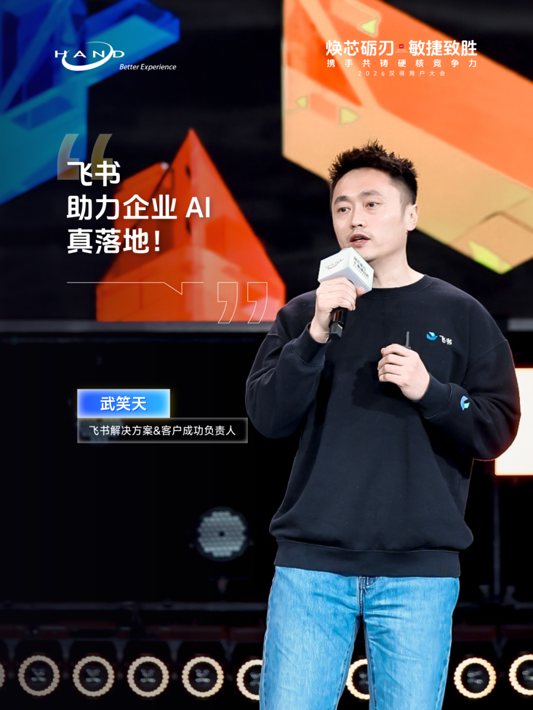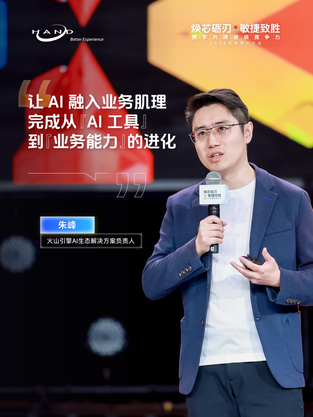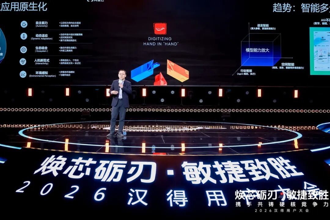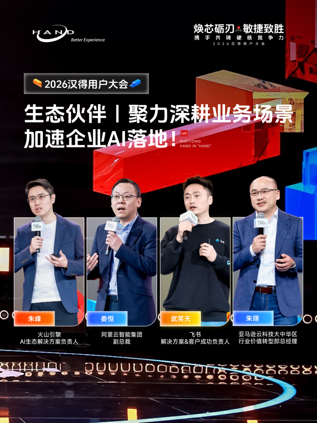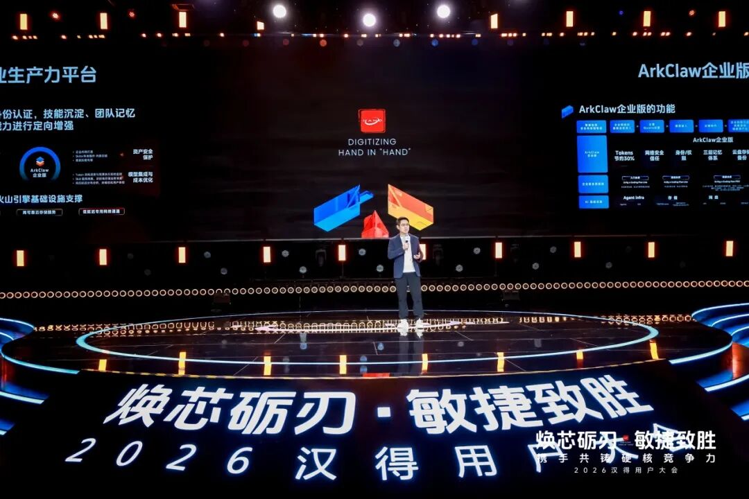2026汉得用户大会现场,来自火山引擎、阿里云、飞书、亚马逊云科技等全球领先科技生态伙伴,也分别从各自的专业领域出发,深入探讨 AI 如何重塑企业级应用范式,以及与汉得携手打造的 AI 联合解决方案。 火山引擎助力 AI 云上增长 Enterprise AI 的应用重塑机遇 火山引擎厂商& AI 生态解决方案负责人朱峰发表题为《火山引擎助力 AI 云上增长、Enterprise AI 的应用重塑机遇》主题演讲,聚焦大模型从技术风口迈向产业深水区的行业趋势,分享 AI 技术实践与企业级解决方案,以及火山引擎与汉得的联合共创成果。 朱峰指出,当前 AI 领域两大热点正重塑行业认知与生产力格局。其一,火山引擎春节前发布的Seedance 2.0 模型,将 AI 视频生成能力提升至工业级应用水准,有效解决场景一致性、大幅运动等行业难题。其二,Openclaw 的爆发式增长,彻底改变了大众对 AI 的认知。AI 不仅仅是问答、闲聊、搜索、写代码,而是具备可自主决策长时间执行任务的智能体,这个认知改变加速了 AI 进入企业生产力提效的实质性应用。但与此同时,AI 在企业级应用中,也暴露出身份安全、记忆错乱、任务中断、数据备份缺失等痛点,其中安全问题尤为关键,更是企业落地 AI 的核心考量。 火山引擎推出的 ArkClaw 企业版,围绕企业安全,身份认证,技能沉淀、团队记忆,以及协同办公等能力进行定向增强,解决 AI 落地过程中的确定性与安全性问题,同时配备专业团队维护企业级 Skills,让 AI 应用更可靠、更高效。 朱峰强调,AI 在研发领域的应用已成为数字员工落地的核心场景。而面对“AI 是否会替代程序员”的行业焦虑,他提出,相比纠结替代问题,更应聚焦“如何让人类更好地使用 AI”:从广度上,让财务、运营等非技术人员通过意图交互等方式参与到编程上下游环节,实现全民创新;从高度上,借助 AI 能力让初级程序员也能解决分布式系统、底层内核优化等资深架构师级别的硬核问题,提升整体行业技术水平。 朱峰表示,企业 AI 落地并非单纯搭建智能体,还需要火山引擎这样的技术厂商与汉得这样的专业伙伴深度协同。 过去几年,火山引擎跟汉得一起在多个领域深度合作,例如在零售行业,双方联合打造面向零售行业的“AI 品牌玩伴”解决方案,它不仅能拟人化地解答用户疑问,还能精准推荐商品与活动,更是品牌面客的前置智能客户服务专员,能够深度洞察消费者需求,构建品牌与用户之间的互动桥梁,助力企业实现营销提效与渠道数智化转型。 面向未来,火山引擎将与汉得持续深化合作,充分发挥各自技术与行业落地优势,实现 1+1>2 的协同效应,携手为更多行业打造有价值的 AI 解决方案,共同助力企业把握 AI 机遇,实现数智升级! 阿里云全栈 AI 战略实践 全面助力产业智能化加速 阿里云智能集团副总裁娄恒发表题为《阿里云全栈 AI 战略实践,全面助力产业智能化加速》主题演讲,全面介绍了阿里云与汉得当前聚焦企业全栈 AI 服务展开的联合共创成果。 娄恒指出,AI 技术正实现多维度突破,大模型从语言智能向空间、行动智能全方位拓展,企业 AI 应用也从传统 Agent 向 AI 原生应用升级,成为落地核心方向。 针对企业 AI 落地痛点,娄恒直言当前个人 AI 工具落地效果显著,但企业级 AI 落地普遍困难,技术仅能解决 20%-30% 的问题,更多取决于企业人才、组织机制、数据治理、业务流程适配等配套能力,并非单纯采购工具即可实现。对此,娄恒提出战略先行、场景为王、工程赋能三大破局关键。 为推动场景从规划走向落地,娄恒介绍道,阿里云联合汉得打造 AI 创新落地工作坊机制,通过 1-3 天的沉浸式共创,完成 AI 共识建立、场景梳理、场景验证、流程推演、快速原型搭建与业务端 UAT 验证,推动业务、科技与合作方形成共识,实现从架构设计到场景落地的全流程验证。 阿里云正以全栈式能力为企业 AI 落地提供全方位支撑,不仅提供算力、云基础设施、大模型、PaaS 平台、Agent 平台等底层能力,还打造了丰富的云上 SaaS 应用,解决企业数据合规问题,同时为出海企业提供一站式的海外 SAP、Salesforce 对接服务,并推动 ERP 等传统业务系统的 AI 化改造,实现与千问大模型的深度集成。 他强调,基于多年的深度合作,阿里云与汉得已共同打造 AI 端到端全栈联合解决方案:阿里云提供底层多元化算力、云上部署环境与全栈基础模型能力,汉得贡献深厚的行业顾问人才储备和丰富的企业端应用实践,共同为用户提供完整的 AI 落地方法论,并依托千问大模型与汉得 H-ZERO 企业级 PaaS 平台,为企业打造 AI 基座,通过“产品+实施”的深度融合,构建深耕行业场景的智能应用,阿里云与汉得将共同加速推动千行百业的智能化与国际化进程。 未来,阿里云将持续发挥技术与生态优势,与汉得深化合作,从战略规划、场景筛选到工程落地为企业提供全流程支持,破解企业 AI 落地的各类难题,助力企业真正实现 AI 的规模化落地与价值释放! 从工具到伙伴 AI Agent 时代的企业新范式 飞书解决方案 & 客户成功负责人武笑天发表题为《从工具到伙伴:AI Agent 时代的企业新范式》主题演讲,聚焦 AI Agent 时代企业发展新范式,解析飞书从协作工具到企业 AI 伙伴的进化之路。 谈及 AI 技术的企业级演进,武笑天表示,当前大模型已正式迈入企业级可用范畴,但 AI 要真正为企业创造价值,仍需结合实际场景持续探索实践。飞书也始终与客户一起,在 AI 落