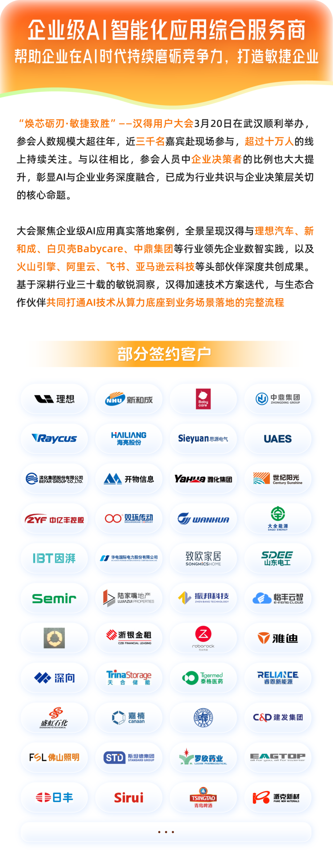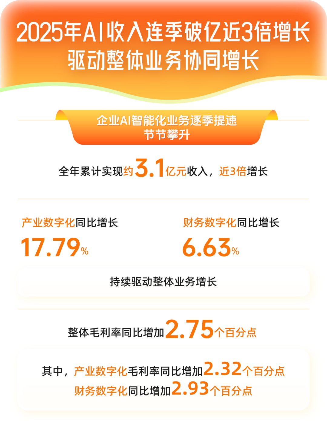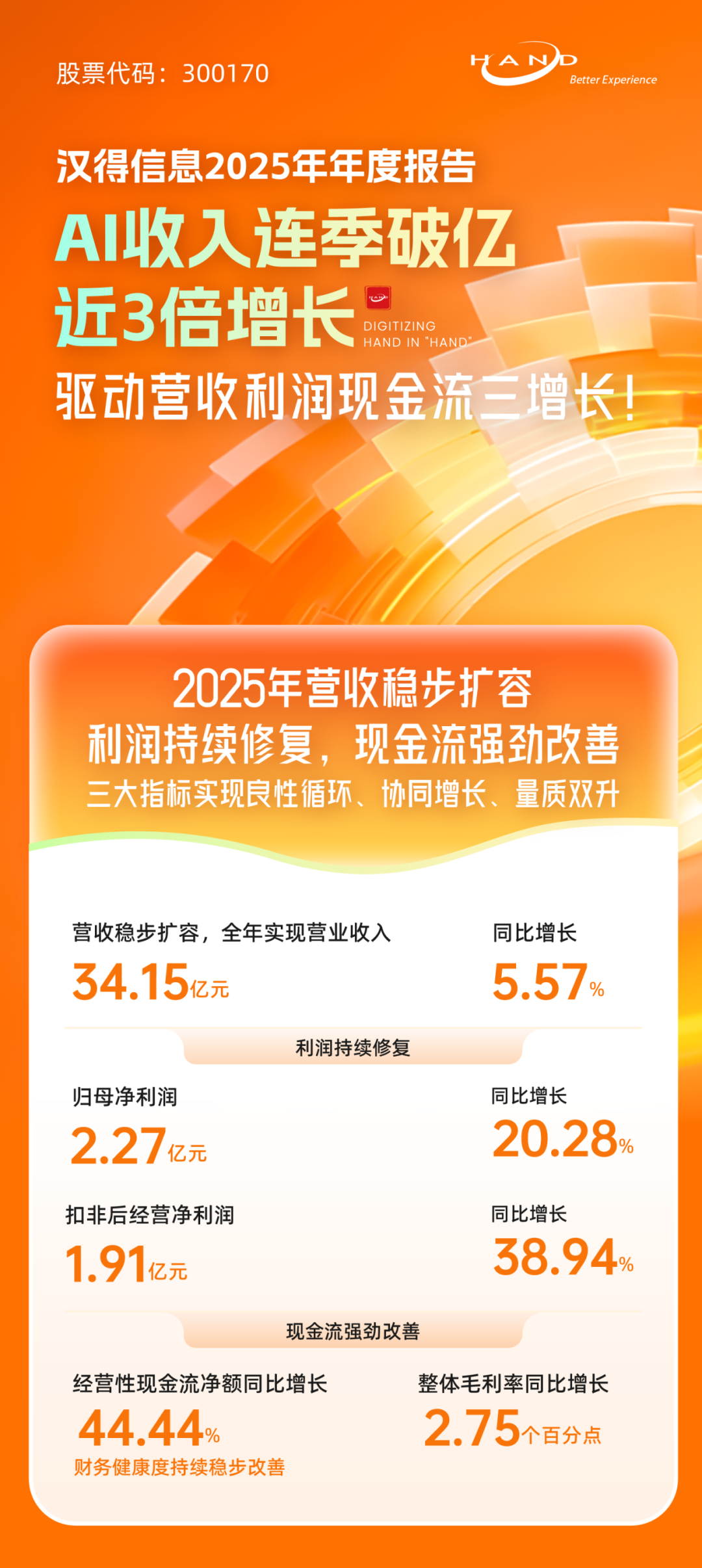 汉得信息2025年年度报告发布 AI收入连季破亿近3倍增长 驱动营收利润现金流三增长 2025年营收稳步扩容,利润持续修复,现金流强劲改善,三大指标实现良性循环、协同增长、量质双升。 营收稳步扩容 全年实现营业收入34.15亿元,同比增长5.57% 利润持续修复 归母净利润2.27亿元,同比增长20.28%,扣非后净利润1.91亿元,同比增长38.94% 现金流强劲改善 经营性现金流净额同比增长44.44%,财务健康度持续稳步改善 整体毛利率同比增长 整体毛利率同比增长2.75个百分点 2025年AI收入连季破亿近3倍增长,驱动整体业务协同增长。 企业AI智能化业务 企业AI智能化业务逐季提速,节节攀升,全年累计实现约3.1亿元收入,近3倍增长 驱动整体业务增长 产业数字化同比增长17.79%,财务数字化同比增长6.63%,持续驱动整体业务增长 整体毛利率同比增加 整体毛利率同比增加2.75个百分点,其中,产业数字化毛利率同比增加2.32个百分点,财务数字化同比增加2.93个百分点