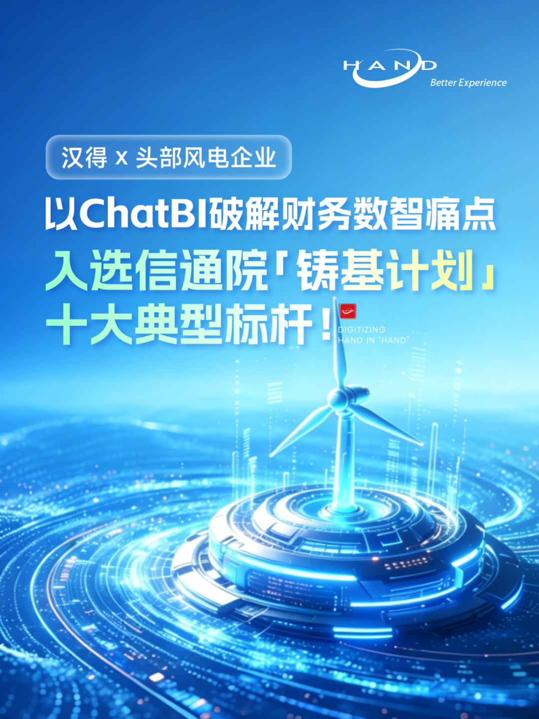 在企业数字化转型进入深水区的今天,财务数据已成为经营决策的核心支撑,但是传统财务分析面临数据响应滞后、使用门槛高、人工工作量巨大等多种困境。 汉得携手某头部风电企业,以ChatBI为核心抓手,打造智能财务分析项目,成功破解行业痛点,树立财务数智化转型标杆,更顺利通过中国信通院“铸基计划-2025年十大高质量数字化转型”评审,斩获《高质量数字化转型典型案例》荣誉! 打造全流程智能体系 “变活”财务数据 某头部风电企业是全球可信赖的能源合作伙伴,致力于推动能源变革,公司深度聚焦能源开发、能源装备、能源服务、能源应用四大领域,以技术创新提升可再生能源利用效率。企业多次入选国内外多项权威影响力榜单,在可持续发展领域获得广泛认可。 近年来,该企业数字化转型进程加速推进,财务数据作为企业经营决策的核心支撑,其价值深度挖掘与高效应用已成为提升企业核心竞争力的关键抓手。 目前,企业财务体系内已沉淀900余张各类财务报表,全面覆盖从基础账务数据到核心财务指标的全维度信息。 然而,随着高质量发展对数据时效性、便捷性要求的持续提升,现有财务数据管理模式已难以适配实际经营需求,亟需通过数字化工具重构应用模式,充分释放财务数据价值。在此背景下,当前主要面临以下挑战: 💢数据获取链路冗长,决策响应严重滞后 企业财务各层级人员获取数据需遵循固定且多环节的流程,复杂需求常需跨多张报表反复调取,并依赖大量手工清洗、整合与可视化处理,单次耗时动辄数小时甚至1-2个工作日。数据响应效率低下,管理层难以在关键决策窗口期内获得及时支撑,在市场突发应对与经营策略快速调整等场景中尤为被动。 💢技术人员负荷过重,核心工作推进受阻 企业沉淀的900余张财务报表维护及全公司数据提取工作高度集中于少数报表技术人员,日均需应对10-15个高频数据需求,其中近三成为重复或简单请求。大量基础性工作挤占技术人员超七成精力,导致报表体系优化、数据质量管控、新系统对接等核心任务推进迟缓,需求积压严重,拖累财务数字化整体进程。 💢数据口径易生偏差,经营决策潜藏风险 财务数据涉及复杂统计口径与多维维度,人工传递需求过程中信息理解偏差频发,导致数据结果与预期不符,反复返工沟通。复杂场景下跨报表的手工整合存在操作失误风险,管理层若基于偏差数据制定策略,将为企业带来直接的经营隐患。 ChatBI智能财务分析解决方案 人人可用的“智能财务助手” 针对企业财务分析中普遍存在的“数据获取难、分析效率低、口径不一致”等痛点,汉得并未采用传统报表工具简单替代的模式,而是依托在AI与数据领域的深厚积累,为企业量身打造ChatBI智能财务分析解决方案。 区别于传统的固定报表开发模式,汉得ChatBI构建起“自然语言驱动 + 智能语义解析 + 多维度数据透视”的统一分析平台。 该平台以AI大语言模型与BI商业智能能力深度融合,搭建起从“自然语言提问”到“智能解析查询”,再到“分析解读与决策建议”的全闭环体系,让财务分析不再依赖复杂的技术操作,真正实现“人人可用、即问即答”。 在此基础上,汉得与客户团队紧密协作,聚焦财务分析全流程,率先落地七大核心场景,实现从报表查询到深度分析的全面智能化突破: 七大核心场景全覆盖 精准破解业务痛点 法报数据分析 告别手工导出报表、手动加工对比。支持合并组、单体公司、科目逐级下钻,自动生成同比环比分析、瀑布图展示及结构化分析报告,月均节省人工28小时; 账龄分析 覆盖应收、应付、预收、预付等多维度账龄明细,无需手工钻取多个表格,快速生成账龄报表,助力坏账风险评估与现金流健康度把控; 序时账问数 对接SAP序时账,支持收入、成本、毛利、回款、税金等全维度灵活查询,解决业务部门问数频繁、财务手工应答工作量大的难题; 对公汇联易报销数据分析 打通汇联易系统数据,1分钟内响应机票预订比例、部门费用同比等查询需求,统一数据口径,减少跨部门核对成本; 年度预算费用数据分析 整合SAP序时账与线下预算数据,支持多维度预实对比分析,快速识别费用异常,助力预算管控与资源优化。 从“数据孤岛”到 “智能问数” 构建财务分析新范式 该项目并未止步于单点工具的上线,而是以ChatBI平台为核心,构建起一套完整的财务智能化体系建设: ✅ 搭建统一数据底座:完成26个模型设计、81张表入湖梳理,统一指标计算逻辑,明确数据来源与版本,为数据治理奠定坚实基础; ✅ 配置智能分析助手:配置1个财务助手、24个数据集及480+个专业术语,实现财务语义的精准识别与解析; ✅ 全场景落地验证:通过两轮系统化测试,1734个核心问题测试通过率100%,七大场景全部上线试运行,每月使用频次稳步提升。 技术赋能提效 打造“提问即分析”的智能体验 采用 “AI大模型 + BI智能分析 + 统一数据底座” 的组合技术路径,实现三大核心突破: ✅ 降低使用门槛:融合AI大语言模型与BI商业智能能力,业务人员、财务人员均可通过自然语言提问,秒级获取精准数据结果与分析结论,让财务数据“人人可用”; ✅ 提升分析效率:替代传统“导出表单→手工整理→筛选对比”的繁琐流程,各场景平均提效80%以上,让财务人员从重复的数据加工中解放,聚焦核心分析与决策工作; ✅ 统一数据口径:通过梳